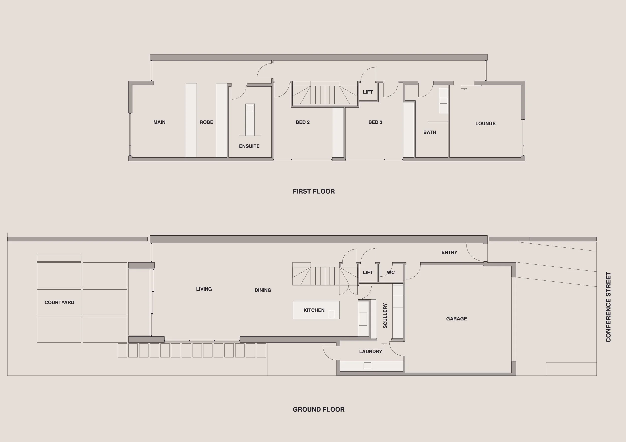35 and 37 Conference Street introduces two contemporary townhouses to the heart of the city. Each offers three bedrooms, two living areas, and a double garage, designed with flexibility for modern life.